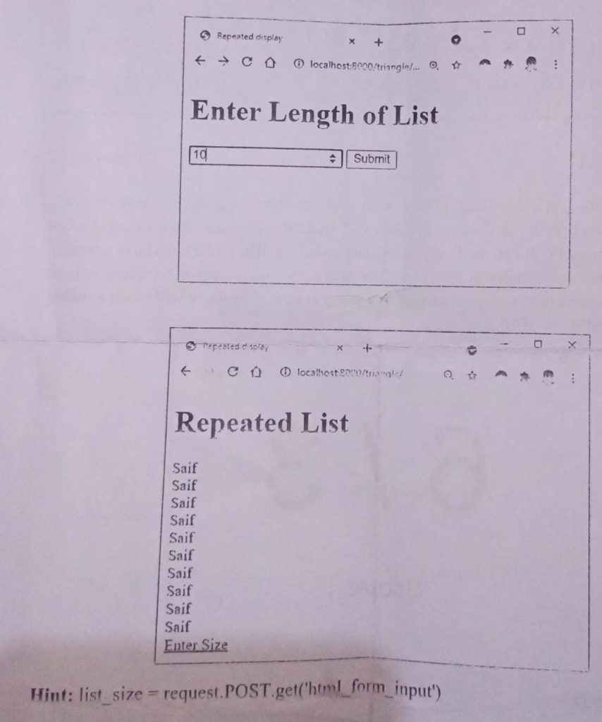 Write the complete code for a Django app that takes a number input from user to display a particular string e.g your name that many times. If user enter 10 the templates should display his her name 10 times in an unordered list.