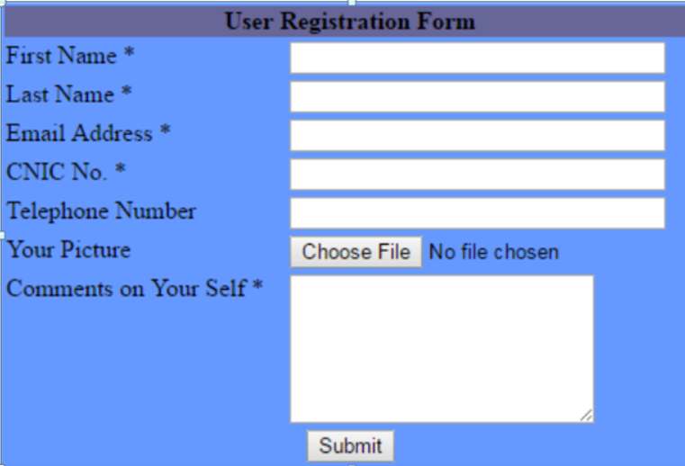 - Suppose user uses the following form to get registered with your Create a database with the name “testdb”. In this database create a table users with columns names user_Id, user_Name, user_Email, user_CNIC, user_Comments and user_Picture. Write the code that [10]